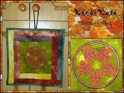 Már rég szerettem volna valami kifejezetten foltosat és az sk festett anyagokat is használni akartam már – tegnap délután egymásra talált a két ötlet, megfűszereztem egy kis Gézás hímzéssel és ez az őszi ajtódísz lett belőle. Sajnos a szabad gépi tűzésnél akadtak problémáim, így későn vettem észre, hogy az egyik levél erezete lemaradt, de sebaj, ő már így marad.